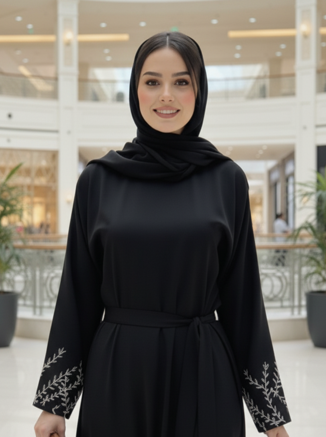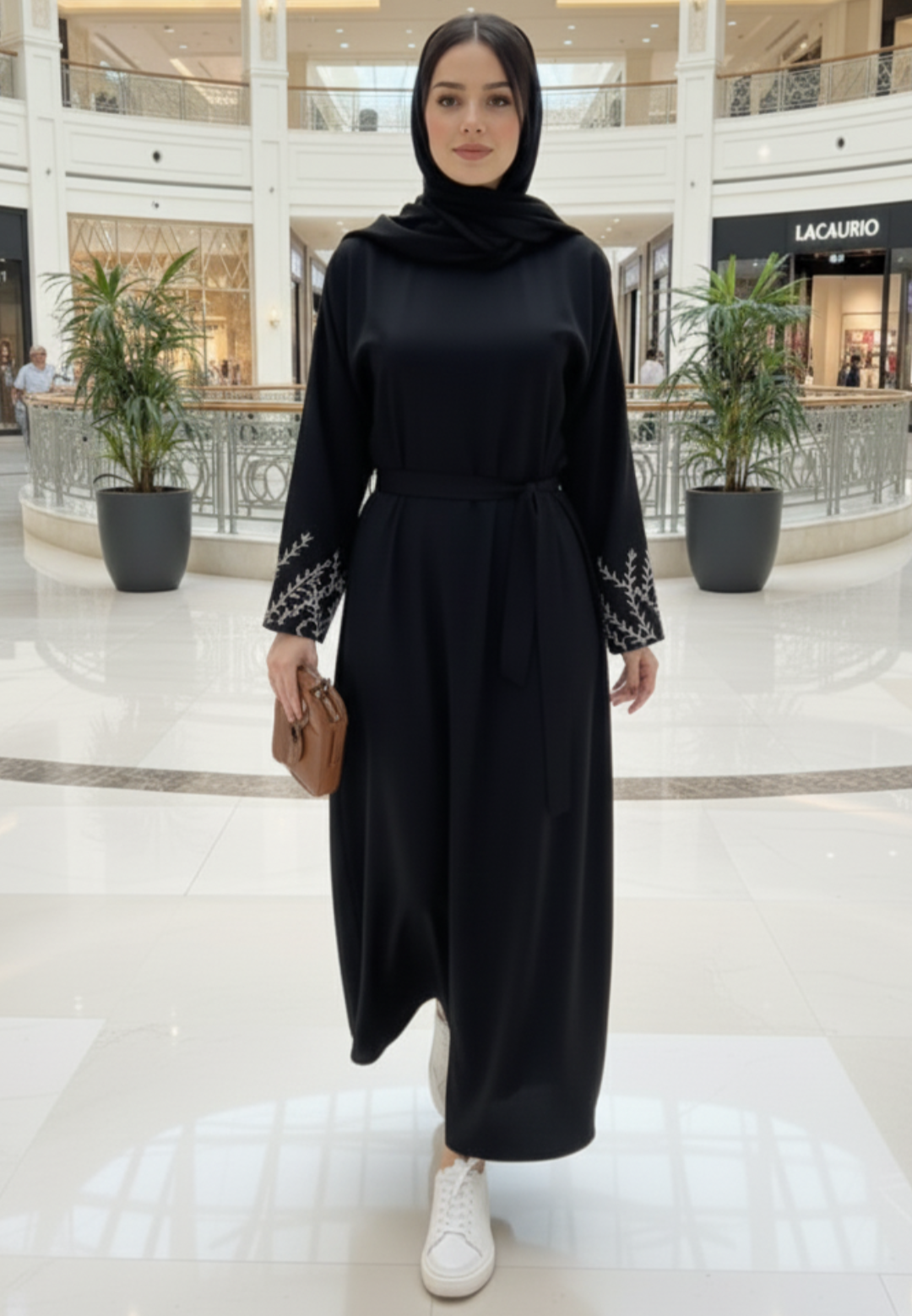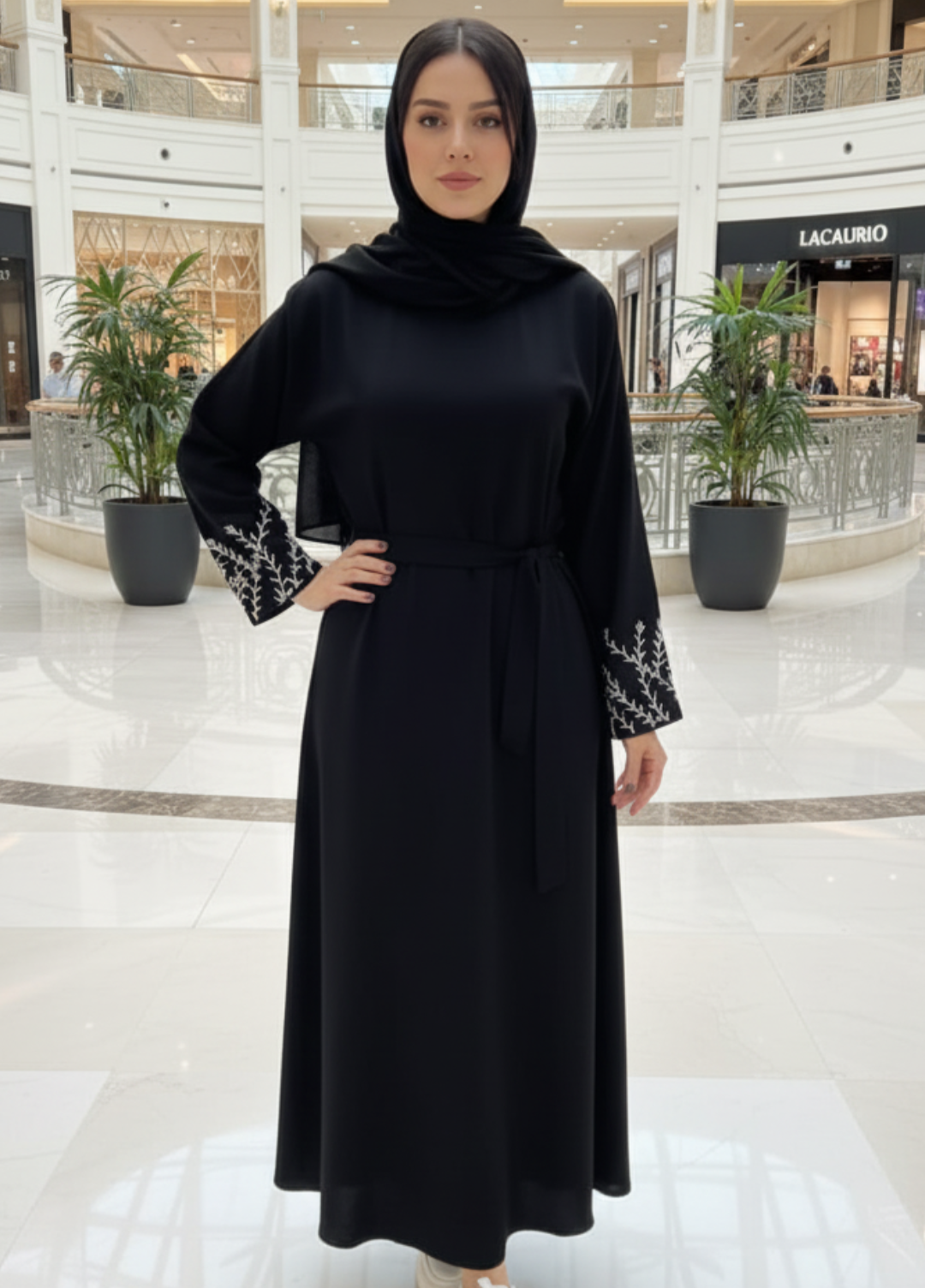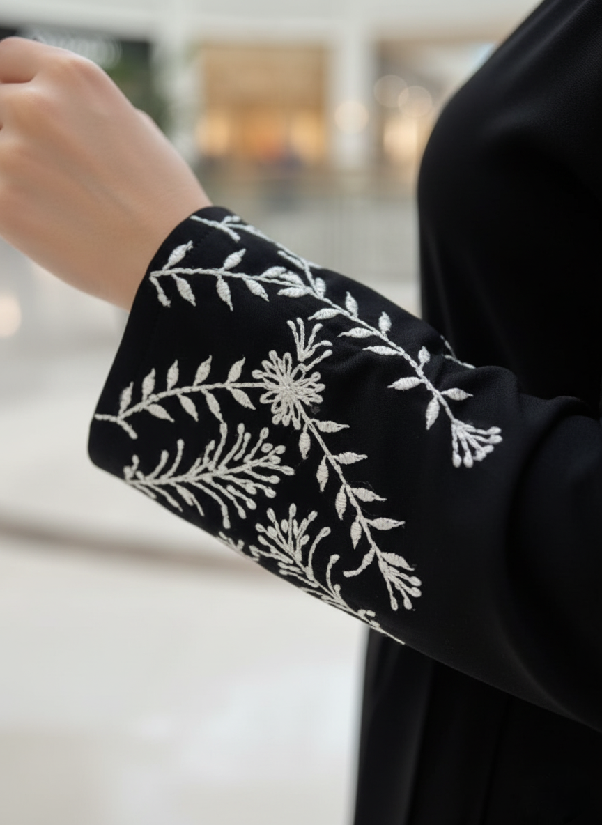 Sleeve Detail (Highlight): The most distinctive feature is the detailed embroidery on the cuffs of the sleeves. This embroidery is in a contrasting, light color (likely silver or white/cream) and features an organic, floral, or leaf-branch motif. This detail elevates the abaya from simple to sophisticated.